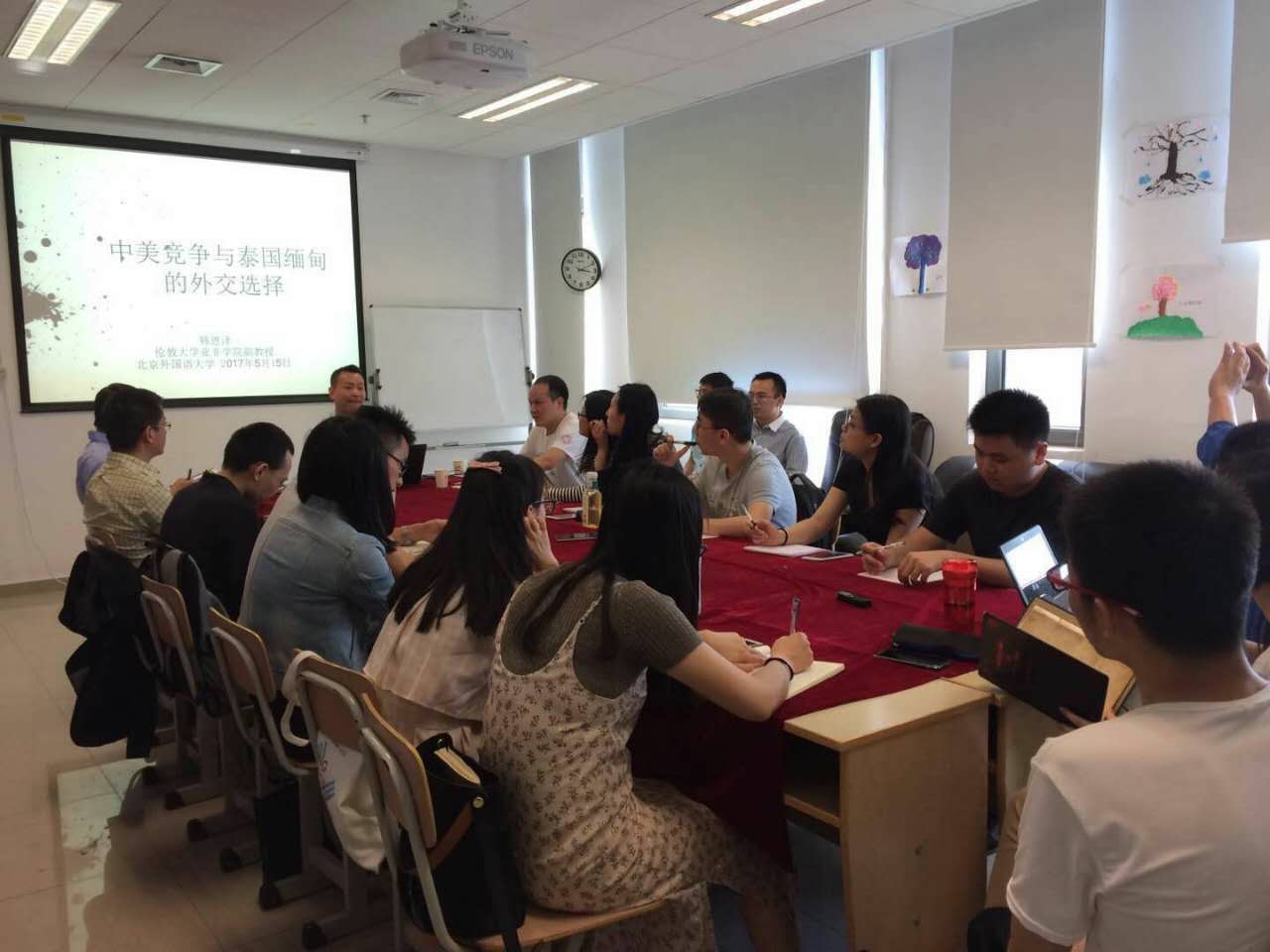 2017年5月15日下午3点至5点,北外国关学院在西院综合楼1151会议室举办了北外国关前沿沙龙第十六期活动,活动主题为“中美竞争与泰国、缅甸的外交选择”。本次活动邀请的嘉宾为伦敦大学亚非学院(SOAS,University of London)政治和国际关系学系副教授韩恩泽,尹继武教授主持,张效民副教授和史泽华副教授分别担任评议人,来自北京外国语大学和其他高校及研究机构的众多学者和同学也参与了讨论。