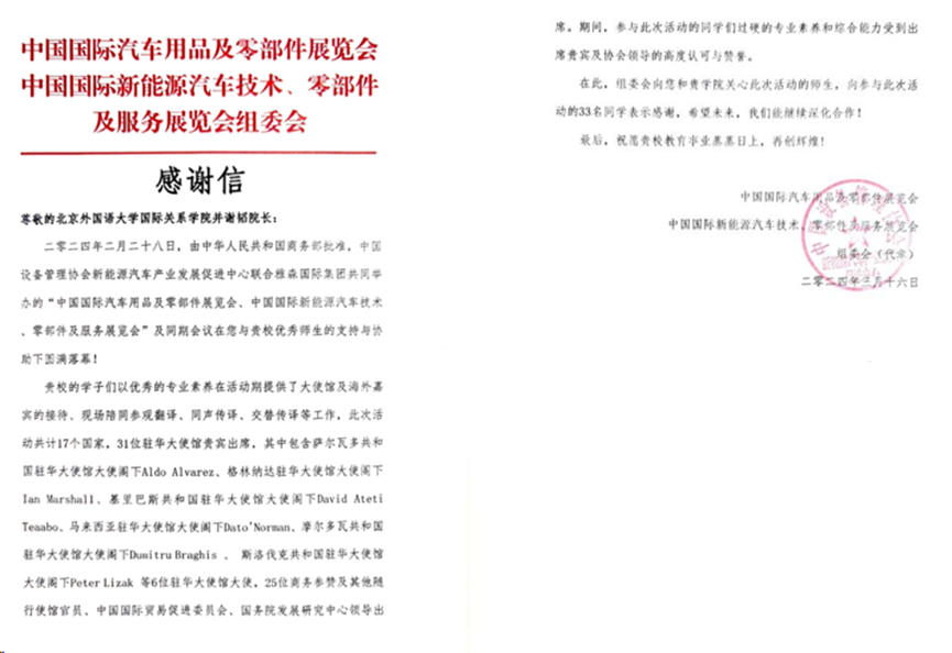 第34届中国国际汽车服务用品及设备展览会暨第2届中国国际新能源汽车供应链大会于2024年2月28日至3月2日在北京中国国际展览中心举办,北外必赢bwin线路检测中心共派出33名志愿者参与外宾接待服务。此次会展活动共有17个国家参与,31位驻华大使馆贵宾出席,其中包括6位驻华大使馆大使与25位商务参赞,以及其他随行使馆官员、中国国际贸易促进委员会、国务院发展研究中心领导。期间,参与此次活动的同学们凭借过硬的专业素养和综合能力,赢得了出席贵宾及协会领导的高度认可与赞誉。