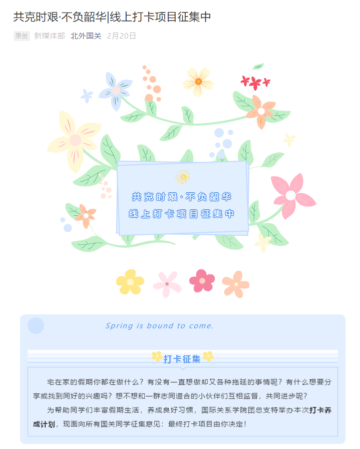 1、共克时艰,不负韶华 ——疫情期间线上打卡活动