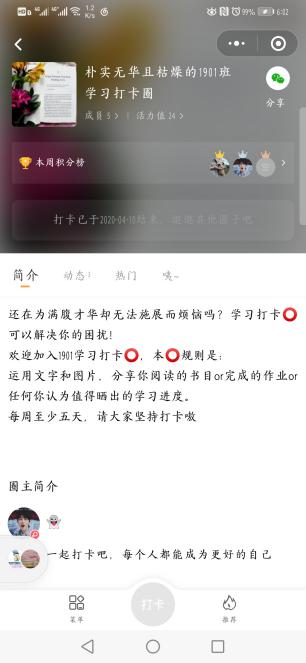 “凡事预则立,不预则废”,1901班团支部举办了“青春战役,你我同行”主题线上打卡活动,通过设立学习圈、健身圈、早期圈、音乐影视分享圈四大打卡圈子,规定相应打卡规则,督促大家一起进步。一个月的时间,同学们积极参与打卡活动,共发布103条打卡动态,302次点赞,留下许多美好的足迹。
