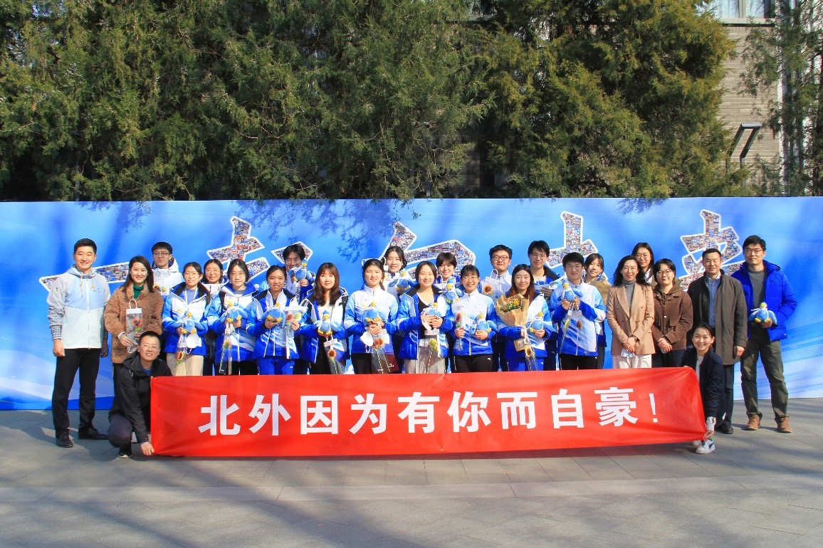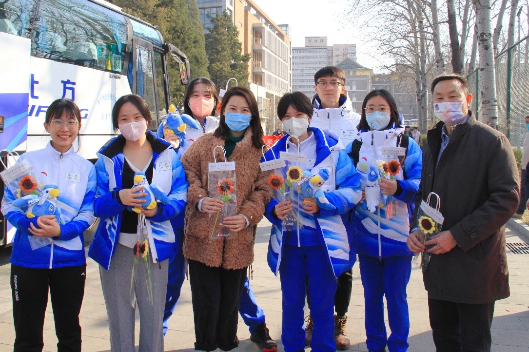 3月8日下午,我院首批首钢滑雪大跳台冬奥师生志愿者圆满完成北京2022年冬奥会志愿服务任务,从隔离地点平安返校。学院党总支书记张效民老师、辅导员钱梦婷老师、辅导员张翊老师及同学们早早等候在东校区文化广场,热烈欢迎志愿者们凯旋。