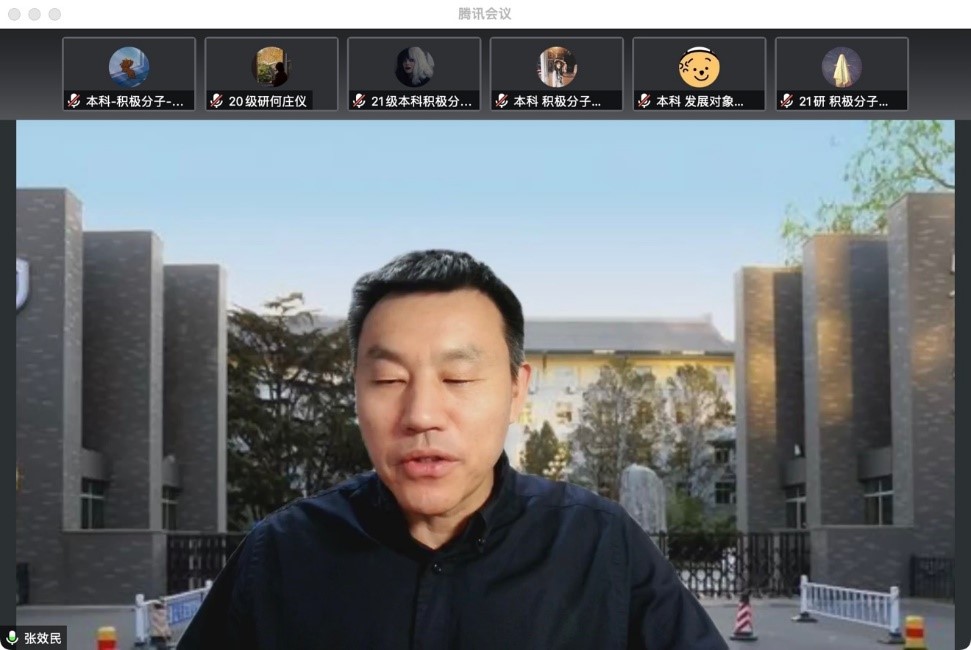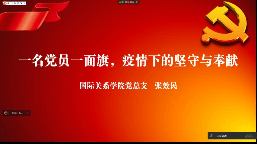 张效民书记从当前疫情形势和党员坚守奉献两个角度为大家解读了当前的疫情现状、当前中国“动态清零”政策以及学校的疫情防控举措。张效民书记强调,作为学生党员和积极分子,要以实际行动做出表率,拥护党和政府的“动态清零”政策,遵守学校疫情防控的各项规定,做好个人防护和管理,起到先锋模范作用。他指出,疫情也是考验,同学们要学会及时调整自己的心理和情绪,在疫情中成长,在危机中历练;疫情防控也是一堂爱国教育课,同学们要籍此塑造中国情怀,反驳批判西方对中国疫情以及中国防控政策的歪曲、抹黑和污名化,利用可能的机会讲好中国抗疫故事;作为国际关系专业的学生,要发挥学业专长,认真研究疫情下的国际政治议题和国别政治议题,提升自己的专业本领。最后张效民书记解答了学生关于当前学校疫情防控政策的一系列问题。