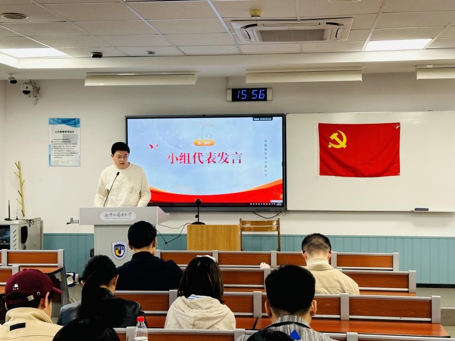 本次主题活动第一项为博士生党员主题发言。2019级博士生王天禹以解读《政府⼯作报告》吹风会为切入点,选取报告中与中国外交相关的重要内容,发表了题为《“新时代新征程”中国特色大国外交的智慧与贡献》的讲话,提出中国外交发展的重点是推动全球安全治理体系改⾰、破解国际安全困境以及推进构建⼈类命运共同体。2019级博士生凌梦远的发言题目为《向“新”力十足,构建新型能源体系建设》,提出新型能源体系是社会主义现代化强国建设的关键抓手、是国家能源安全和国家竞争力的有力保障,也是是实现“双碳”目标以及推进生态文明建设的重要支撑;2021级博士生袁田西竹浅析了当下中国青年的美国观,认为当代青年正站在新的历史起点,生逢其时、重任在肩,应自觉担负起历史使命,助力中国特色大国外交、扬帆前行。青年人承担着中华民族伟大复兴的光荣使命,需要在党和国家对外工作中发挥作用、传播中国故事的积极传播者、实践国家重大外交理念。