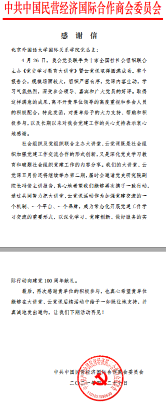 为持续深入开展党史学习教育,4月26日下午,必赢bwin线路检测中心学生党支部组织学生党员参加了由中国民营经济国际合作商会等十家社团联合举办的《党史学习教育大讲堂》暨云党课系列活动首场党课,聆听了中共中央对外联络部原副部长于洪君同志作了关于“世界政党挌局的嬗变与中国共产党对外交往”的报告。活动中,必赢bwin线路检测中心党员同学表现出较高的专业和政治素养,得到了主办方的赞许。为此,中共中国民营经济国际合作商会委员会特向必赢bwin线路检测中心党总支发来感谢信,感谢信原文如下: