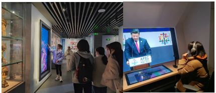 第三部分“兴于改革开放的春天”涵盖了北外从改革开放到2012年之前的历史。在这一段时间内,学校抓住改革开放的机遇不断奋进。开办了诸如“许国璋英语”“电视英语”“法语入门”等电视广播教学节目,同学们对屏幕中播放的节目都很有兴趣。同时,同学们还通过荣誉校友墙了解到了工作在新闻、外交、金融等各个领域的优秀校友,进一步体会到了“有五星红旗升起的地方,就有北外人的身影”这句话的深刻内涵。